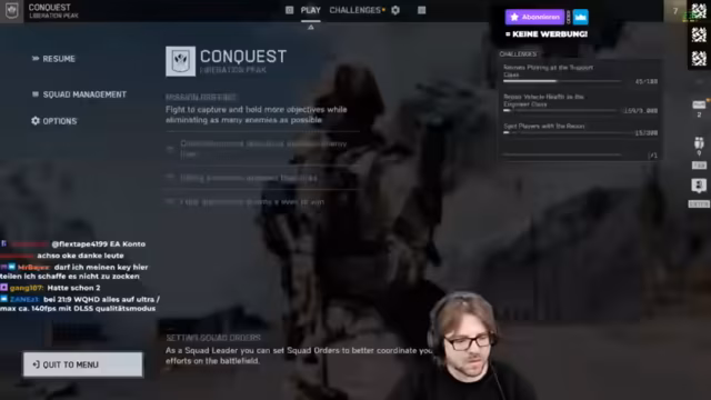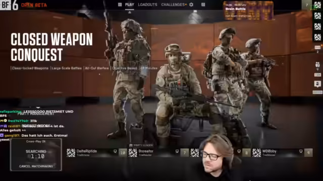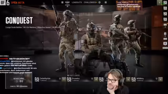 00:00:02Der Stream beginnt mit dem Einstieg in die Closed Beta von Battlefield 6. Der Fokus liegt auf der Map Siege of Cairo, die im Close-Combat-Stil gespielt wird. Es werden erste technische Hürden wie das Einlösen von Beta-Codes über die EA-App und nicht vorhandene Serverbrowser diskutiert. Wichtig ist der Hinweis, dass der Zugang zur Beta über Twitch-Drops erfolgt und nicht per E-Mail. Das Matchmaking und die Warteschlangen werden als problematisch beschrieben, da ein Neustart des Spiels die Position in der Warteschlage zurücksetzt.