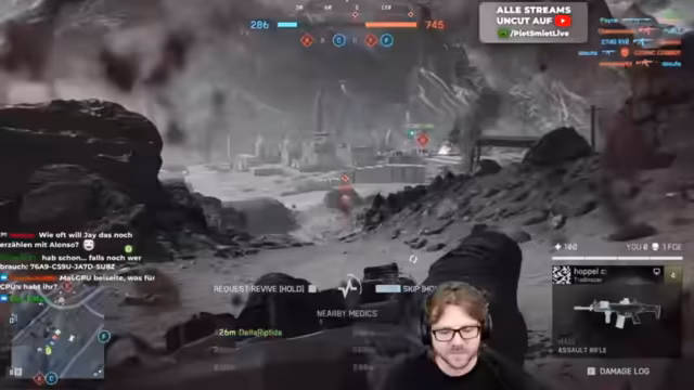 04:15:00Der Streamer startet mit intensivem Gameplay aus der Battlefield 6 Closed Beta. Er beschreibt die taktischen Herausforderungen auf der Karte 'Bergstürmer', wo das Team versucht, die Flaggen B und C zu verteidigen und zu erobern. Die Kommunikation ist entscheidend, wie ein gezielter Medic-Einsatz zeigt. Der Streamer ist von der schnellen Action und den klaren Siegbedingungen, die Punkte nicht zu verlieren, sehr begeistert. Es werden erste Waffen freigeschaltet, darunter die AK-205, was zu positiven Reaktionen führt und den Spaßfaktor unterstreicht.