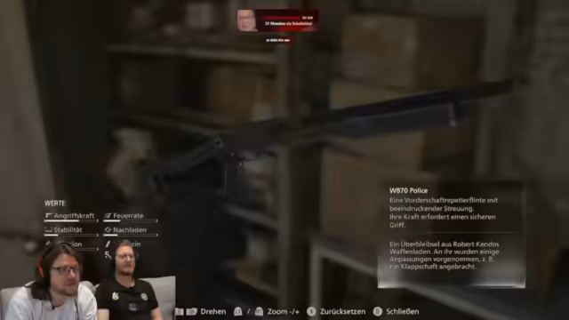 05:17:16Die Erkundung der Tankstelle führt zur Entdeckung mehrerer Container und Schließfächer, die wichtige Gegenstände enthalten. Nachdem der blaue BSAA-Schlüssel gefunden wurde, wird ein Container geöffnet, der eine M1-Gewehr enthält. Dieses wird mit dem bereits gefundenen Flachläufer-Gewehr verglichen. Die M1 bietet eine höhere Feuerrate, schnellere Nachladezeiten und bessere Präzision, während die Flachläufer mehr Feuergewalt bietet. Der Streamer entscheidet sich für die Nutzung der M1 und verfeinert diese mit einer Visierhilfe. Die Suche nach dem richtigen Weg und weiteren Lootobjekten, wie Angeln oder Spielzeug, setzt sich fort, wobei auch Donuts als Fundstücke erwähnt werden.