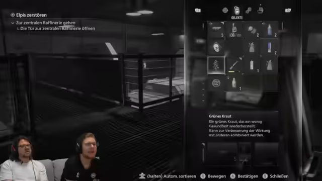11:08:54Die rote Kugel 'Kron' scheint ein weiterer Schlüssel für das Fortschreiten im Spiel zu sein. Während der Erkundung entdecken sie eine Box, aus der ein Licker hervorkommen könnte, wie aus dem Film bekannt. Sie finden zwar weitere Säureflaschen, bemerken aber, dass ihre bisherigen Vorräte nicht ausreichen, um ein weiteres Mal die Flaschen herzustellen. Sie kämpfen gegen einen letzten Gegner im Bereich und stellen fest, dass die Licker nun beseitigt sein sollten, bevor sie ihren weiteren Weg fortsetzen.