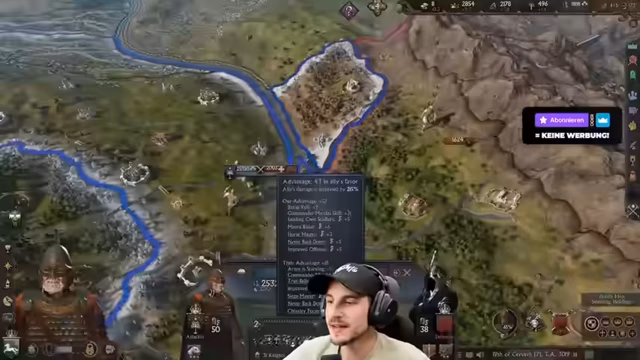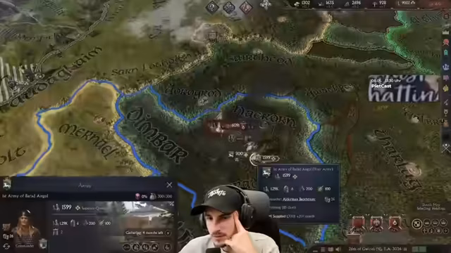02:08:55Unmittelbar nach der Niederschlagung eines Aufstands sieht sich der Streamer einem weiteren Krieg gegenüber, dieses Mal gegen ein Stammesreich innerhalb Gondors. Seine Truppen sind erschöpft und die Moral seiner Vasallen ist gering. Diplomatische Bemühungen, den Aufständischen zu einem Vasallat zu überzeugen, laufen. Zudem wird die Frage nach der Integration eroberteter Gebiete (Stammesgebiet in eine Stadt) und die Möglichkeit, neue Königreiche zu gründen, diskutiert. Die Söldneroption als letzte Reserve wird als sehr teuer eingestuft.