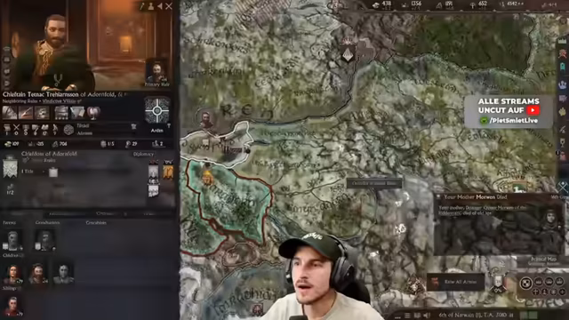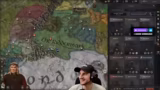 05:18:19Nach dem Tod des Charakters Theoden übernimmt Eomer die Führung. Der Streamer beginnt, das Reich neu zu ordnen, indem er weitere Königreiche unter sein Banner zieht und die Allianz zwischen Gondor und Rohan besiegelt. Er nutzt den Grand Wedding, um seine Dynastie zu sichern und versucht, seine Titel und Domänen zu optimieren, was aufgrund der 'suffering from success'-Situation schwierig ist. Er heuert Gandalf als Söldner an, um seine militärische Stärke zu erhöhen.