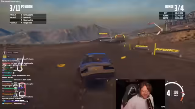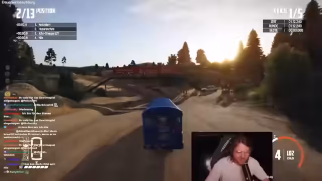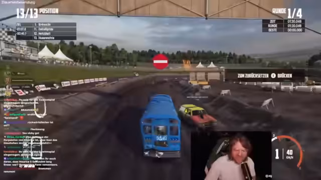 02:37:11Die nachfolgenden Runden sind weiterhin von Unfällen und Kollisionen geprägt, an denen auch der Streamer selbst beteiligt ist. Es kommt zu wiederholten 'Bus-Sandwich'-Situationen und strategischen Rammmanövern. Gleichzeitig werden technische Anpassungen am Spiel vorgenommen, da die Steuerung und Fahrzeugverhalten als seltsam empfunden werden. Die Schwierigkeit wird geändert und das Schaltverhalten von manuell auf Automatik umgestellt, um das Spiel für die unerfahrenen Spieler zugänglicher zu machen. Trotz des Chaos werden die Runden als unterhaltsam und spaßig empfunden.