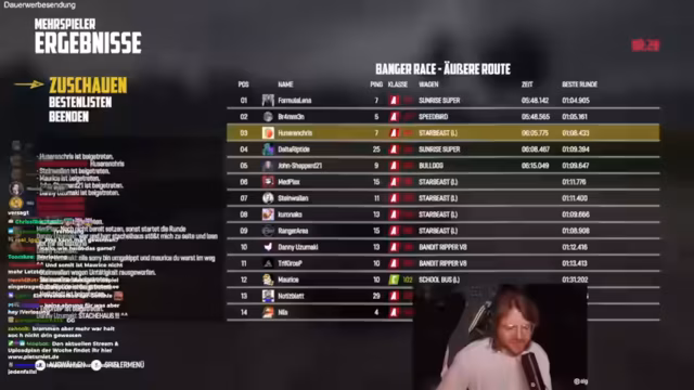 02:40:03Das Rennen ist von großer Verwirrung und chaotischem Fahrverhalten geprägt. Die Streamer erleben häufige Unfälle und Verluste von Lebenspunkten, wobei sich die Schuldfrage oft zwischen den Fahrern verschiebt. Trotzdem wird viel gelacht und über Fehler debattiert, wie zum Beispiel die unzuverlässige Handhabung der Gangschaltung beim Bus. Dennis erkennt ein musikalisches Talent in Chris und plötzlich entwickelt sich ein gemeinsamer Song über das fahren von Bussen, was den ton des Abschnitts von Ärger zu witziger Improvisation wechselt.