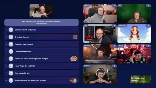02:43:34Die vorletzte Runde des Quiz konzentrierte sich auf einen deutschen Werbeslogan von Citroën aus dem Jahr 1958, der mit einem Großbuchstaben beginnt und ohne Satzzeichen endet. Die Teilnehmer diskutierten lebhaft über die möglichen Slogans und ihre Authentizität, wobei Brammen mit seiner rauchigen Stimme verschiedene Slogans vortrug, um deren Wirkung zu testen. Es gab viele humorvolle Spekulationen und Fehlannahmen, insbesondere bezüglich der Geschichte von Citroën und der Herkunft der "Ente". Die Diskussionen waren geprägt von Unsicherheit und dem Versuch, historische Werbestrategien zu erraten. Am Ende wurde bekannt gegeben, dass der korrekte Slogan "Fahren Sie heute den Wagen von morgen" lautete, was zu einer Überraschung führte, da dies Dalus Vorschlag war und er somit Punkte sammelte.