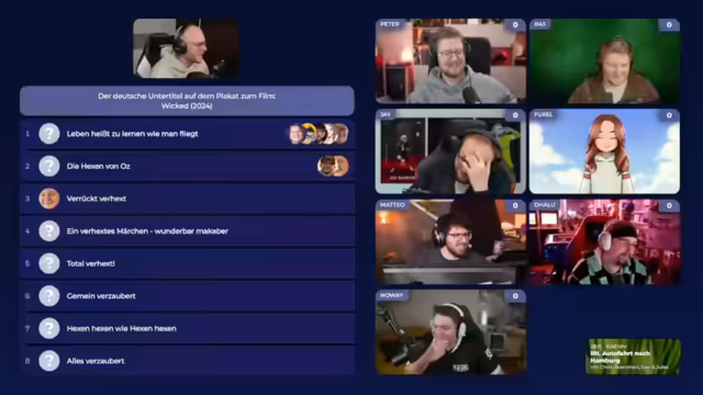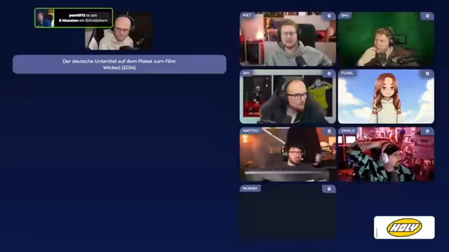 01:36:33Die Live-Ausgabe des Slogs in Conquist beginnt mit den Teilnehmern Peter, Bram, Jay und den Special Guests Fuchse, Matteo, Dalu und No Way. Die erste Aufgabe für die Teilnehmer und Zuschauer ist es, einen deutschen Untertitel für das Plakat des Films "Wicked" aus dem Jahr 2024 zu schreiben. Die Teilnehmer haben 45 Sekunden Zeit, um ihre kreativen Vorschläge einzureichen. Anschließend werden die verschiedenen Vorschläge präsentiert und die Teilnehmer müssen sich für eine Antwort entscheiden, wobei auch das Original dabei ist. Es entbrennt eine Diskussion über die möglichen Untertitel, insbesondere über die Relevanz von Hexenbezügen und die Qualität der Formulierungen. Peter entscheidet sich für Vorschlag 1, "Leben heißt zu lernen, wie man fliegt", da dieser als einziger keinen direkten Hexenbezug hat, was er als genialen Schachzug betrachtet, obwohl er die Formulierung selbst als "beschissen" empfindet. Brammen wählt Vorschlag 2, "Die Hexen von Oz", während Jay sich ebenfalls für Vorschlag 2 entscheidet. Matteo und No Way stimmen für Vorschlag 8, "Alles verzaubert", mit der Begründung, dass es gut zum Thema passt. Die Diskussionen und Entscheidungen der Teilnehmer zeigen die unterschiedlichen Herangehensweisen an die Aufgabe und die Schwierigkeit, den vermeintlich richtigen Untertitel zu erraten.