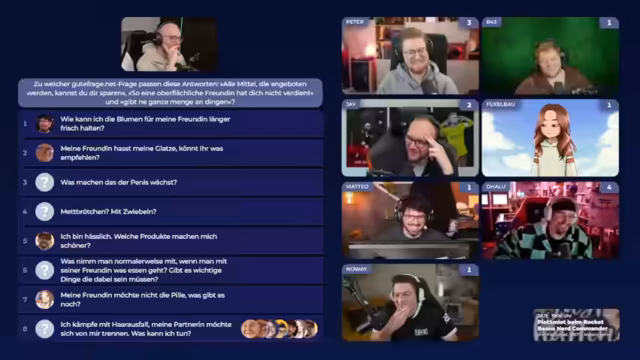 02:02:16Die dritte Runde des Quiz stellt die Teilnehmer vor die Aufgabe, die ursprüngliche Frage zu drei vorgegebenen GuteFrage.net-Antworten zu formulieren. Die Antworten lauten: "Alle Mittel, die angeboten werden, kannst du dir sparen?", "So eine oberflächliche Freundin hat dich nicht verdient." und "Es gibt eine ganze Menge an Dingen." Die Teilnehmer haben 45 Sekunden Zeit, um eine passende Frage zu formulieren, die mit einem Großbuchstaben beginnt und mit einem Fragezeichen endet. Die Herausforderung wird als extrem schwierig empfunden, da die Antworten sehr vage sind und viele Interpretationsmöglichkeiten zulassen. Die Vorschläge der Teilnehmer sind vielfältig und reichen von humorvollen bis zu ernsteren Themen, wie "Wie kann ich die Blumen für meine Freundin länger frisch halten?", "Meine Freundin hasst meine Glatze, könnt ihr was empfehlen?", "Was machen, dass der Penis wächst?", "Mettbrötchen mit Zwiebeln", "Ich bin hässlich. Welche Produkte machen mich schöner?", "Was nimmt man normalerweise mit, wenn man mit seiner Freundin was essen geht?", "Meine Freundin möchte nicht die Pille. Was gibt es noch?" und "Ich kämpfe mit Haarausfall. Meine Partnerin möchte sich von mir trennen. Was kann ich tun?". Die Diskussion konzentriert sich darauf, welche Frage am besten zu allen drei Antworten passt und ob Rechtschreibfehler in den Vorschlägen eine Rolle spielen. Die meisten Teilnehmer tendieren zu Vorschlag 8, "Ich kämpfe mit Haarausfall. Meine Partnerin möchte sich von mir trennen. Was kann ich tun?", da dies am schlüssigsten erscheint. Die Auflösung offenbart jedoch, dass die richtige Frage "Was machen, dass der Penis wächst?" ist, was zu großer Überraschung und Heiterkeit unter den Teilnehmern führt, da niemand diese Antwort erwartet hätte. No Way erzielt hierbei eine hohe Punktzahl, was seine Führung im Quiz weiter ausbaut.