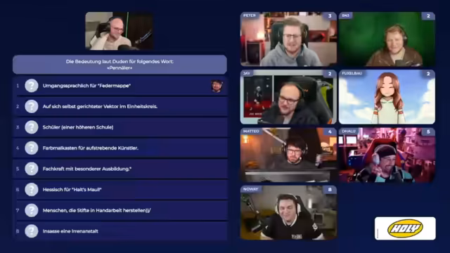 01:47:06In der zweiten Runde des Quiz müssen die Teilnehmer die Duden-Bedeutung des Wortes "Stapes" (oder "Stapes") aufschreiben. Sie haben erneut 45 Sekunden Zeit, wobei die Antwort mit einem Großbuchstaben beginnen und ohne Satzzeichen enden soll. Nach Ablauf der Zeit werden die verschiedenen Vorschläge präsentiert. Die Antworten reichen von "Staatsapparat politischer Erfolge und Siege" über "Hohes Gras in Wüstenbiomen" und "Schale einer Orange" bis hin zu "Holzstämme eines Steges", "Sich mit jemandem auf etwas Untypisches einigen" und "Steigbügel". Die Teilnehmer diskutieren intensiv über die Plausibilität der einzelnen Vorschläge und versuchen, Rechtschreibfehler oder stilistische Ungereimtheiten in den Antworten zu identifizieren, um die richtige Lösung auszuschließen oder zu finden. Matteo äußert Bedenken bezüglich der Großschreibung von "untypisches" im Duden und Peter, der Deutsch Leistungskurs im Gymnasium hatte, wird als Experte herangezogen. Letztendlich entscheiden sich die meisten Teilnehmer für "Sich mit jemandem auf etwas Untypisches einigen" oder "Holzstämme eines Steges", wobei die Unsicherheit und Verwirrung über die korrekte Definition groß ist. Die Auflösung zeigt, dass die richtige Antwort "Steigbügel" ist, bezogen auf das Gehörknöchelchen im Ohr, was die meisten Teilnehmer überrascht und zu weiteren Diskussionen über Bildung und Lateinkenntnisse führt.