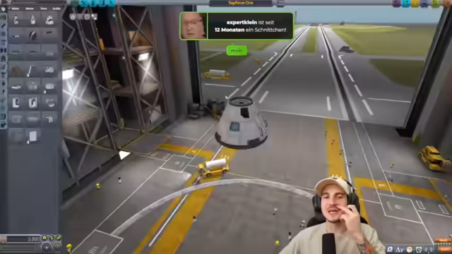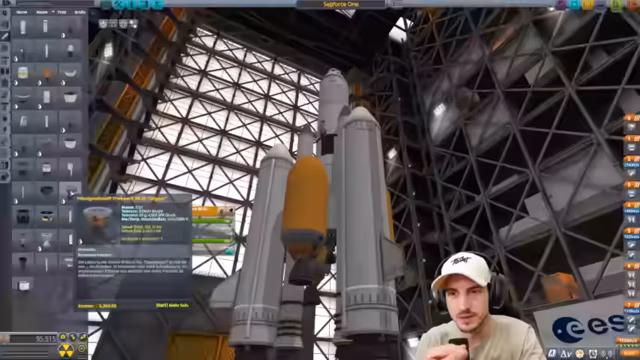 01:03:15Der Stream beginnt mit einem Überblick über das Kerbal Space Program Weltraumzentrum. Es werden die verschiedenen Gebäude wie die Ortungsstation, der Astronautenkomplex, der Raumschiffhangar und die Fahrzeugfabrik vorgestellt. Die Absicht ist es, eine Rakete zu bauen, die den Mond erreicht. Ein Name für die erste Rakete, die Zep Force One, wird im Chat bestimmt. Der Streamer erkundet das Menü zum Raketenbau, sortiert Komponenten nach Größe und Material und wählt eine dreisitzige Kommandokapsel und einen Fallschirm aus.