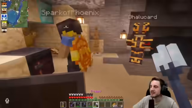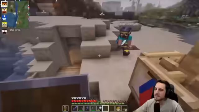 02:42:55Nachdem der Streamer seinen Trident fertiggestellt hat, macht er sich auf den Weg zu Dalus Basis. Er entdeckt, dass die Nutzung des Tridents zum Fliegen Übung erfordert, insbesondere das Starten aus der Luft mit ausgeklappten Flügeln. Er bemerkt, dass er und Dado fast Nachbarn sind und erkundet Dalus aufwendig gestaltete Basis. Dabei fällt ihm ein Geheimgang hinter einem Bild auf, der sich ohne dessen Entfernung öffnen lässt. Dieses Versteck, das durch eine Falltür und einen Faden vor Efeu geschützt ist, beeindruckt den Streamer. Es wird erklärt, dass man Items in einen Trichter werfen muss, um den Zugang zu öffnen, was als clevere und kostengünstige Methode zur Sicherung eines Lagers gelobt wird. In diesem Lager waren einst Dalus Diamanten versteckt, und ein weiterer Ausgang führt direkt durchs Wasser, um mit dem Trident schnell entkommen zu können. Die Basis umfasst zudem ein Lager mit Wasserblick, eine kleine dekorative Farm, einen Eisengolem zur Verteidigung und einen Zugang zu einer Mob-Farm.