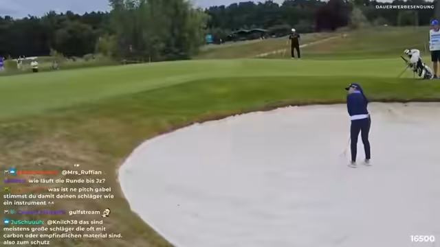 05:42:23Die Gruppe ist auf der 12. Loch und der Streamer dokumentiert ihre Fortschritte und Erlebnisse. Er erwähnt die unterschiedlichen Handicaps und wie sie das Spiel beeinflussen. Sie erleben Pannen wie Bälle im Wasser oder im Bunker landen, aber bleiben zuversichtlich. Der Streamer unterhält sich mit dem Chat über das Golfspiel im Allgemeinen, gibt Tipps für Anfänger wie die Wahl der richtigen Schläger und die Kosten von Golfclub-Mitgliedschaften. Er zeigt sich begeistert von der Atmosphäre und dem Erlebnis des Pro-Am-Turniers.