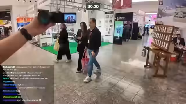 00:27:38Christian trifft ein, nachdem er Schwierigkeiten hatte, den richtigen Eingang zu finden. Er beschreibt seine Irrfahrt aufgrund der Beschilderung und erwähnt, dass er weit außerhalb parken musste. Es gibt weiterhin technische Probleme mit dem Ton, insbesondere Christians Mikrofon ist asynchron. Domi versucht erneut, die Synchronität anzupassen. Christian berichtet von seinen ersten Eindrücken von der Messe, die er als sehr bunt und überwältigend empfindet. Es wird kurz über Fußballtransfers diskutiert. Der Chat gibt Feedback zur Synchronität, und es werden weitere Anpassungen vorgenommen. Es wird spekuliert, was mit den ausgestellten Produkten nach Messeschluss passiert und die Idee eines "großen Fressens" am Sonntagmorgen wird vorgeschlagen. Schließlich wird beschlossen, mit dem Stream im Mittelgang zu beginnen.