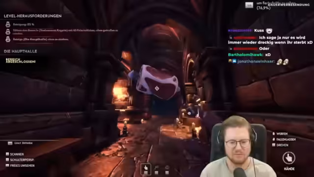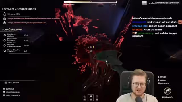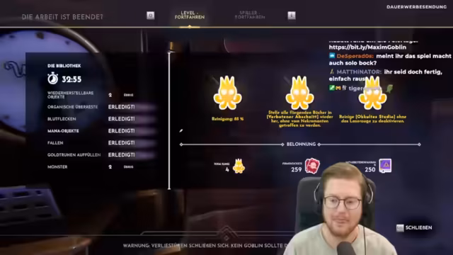 02:16:08Die Gruppe kämpft sich durch versteckte Bereiche, entdeckt Schlüssel und versucht, die letzten goldenen Gegenstände in die Truhe zu legen. Ein Rückschlag erfolgt, als ein Spieler eine Feuerfalle auslöst. Trotz Erreichen von 85% Reinigung bleiben einige Aufgaben unerledigt, wie das Platzieren eines Stuhls und die vollständige Bücherquest. Der Stream endet mit gemischten Gefühlen über den Fortschritt und humorvollen Kommentaren zum chaotischen Gameplay.