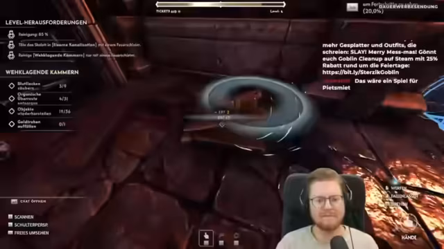 00:06:01Nach dem Quatschen und Reacts wird ab 13 Uhr das Spiel Goblin Cleanup mit Maxim, Sterzik und Red Hat Begins (Vicky) gespielt. Pietsmiet hat bereits das Tutorial ausprobiert und beschreibt es als lustiges Spiel, bei dem es ums Saubermachen geht – eine ironische Anspielung auf die häuslichen Pflichten. Die Vorbereitungen laufen, auch wenn die Technik kurz mit einer Kreissägen-ähnlichen Störung kämpft.