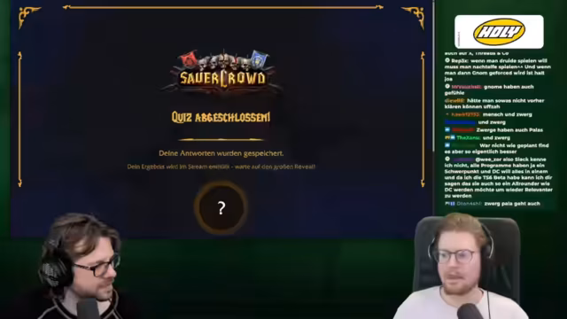 02:23:20Die Teilnehmer beantworten Fragen zu ihren Präferenzen (Humor, Stressreaktionen, Alltagsorganisation), um algorithmisch ihre Rasse zu erhalten. Beispiele: Trockener Humor deutet auf Gnome, Fokus unter Stress auf Zwerge. Diskussionen entstehen über die Komplexität ("32 Fragen sind krass") und strategische Antworten (z.B. Vermeidung von Menschen-Rasse). Ein Teilnehmer expressiert die Hoffnung auf Gnom, während andere über praktische Aspekte wie Quest-Kompatibilität oder Startgebiete (z.B. Teldrassil-Nachteile) debattieren.