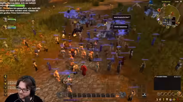 00:56:44Die Teilnehmer versammeln sich im Startgebiet und planen den großen Lauf zur Stormwind-Kathedrale um 18 Uhr. Es wird ein friedlicher Zug mit ständigen 'Friede'-Rufen angekündigt. Da eine Kathedrale nur 40 Personen fasst, werden mehrere 'Rates' (Gruppen) auf verschiedenen Layern benötigt. Ein Layer entspricht einer eigenen Instanz der Welt, die für maximale Spielerzahlen sorgt. Technisch wird erklärt, dass die Welt in mehrere Dimensionen unterteilt ist, um Überfüllung zu vermeiden. Die Organisation obliegt erfahrenen Spielern, während die Community entspannt bleibt.
