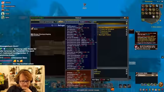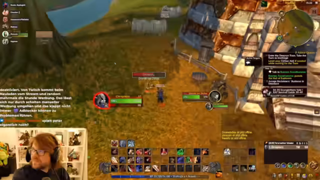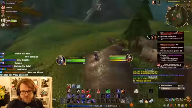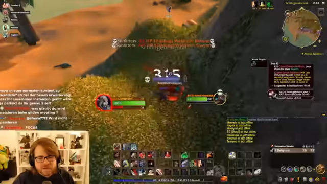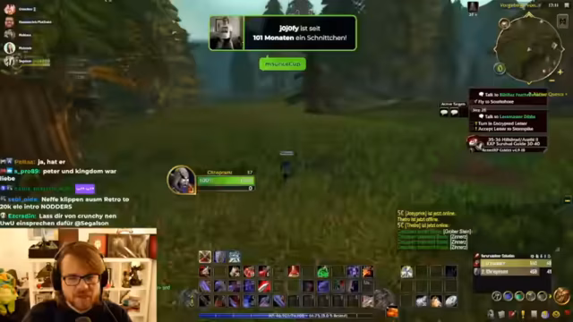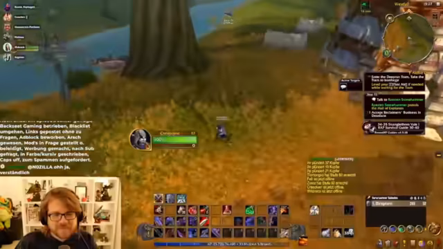 02:15:12Der Streamer konfiguriert die Strike-Flat UI, die ihm im Retail-Modus gefällt, und tauscht sich mit dem Chat über UI-Profile aus. Er erhält ein Shared Profile, sein Interface sieht danach deutlich besser aus. Parallel dazu wird über den Charakterverlust eines Gildenmitglieds gesprochen, der sich offline gemacht und die Kontrolle abgegeben hat, ohne eine Strafe zu verursachen. Währenddessen wird das Leveling im Gebiet Schlingendorn-Tal fortgesetzt, wobei die Quests ab Level 40 deutlich anspruchsvoller und anstrengender werden.
