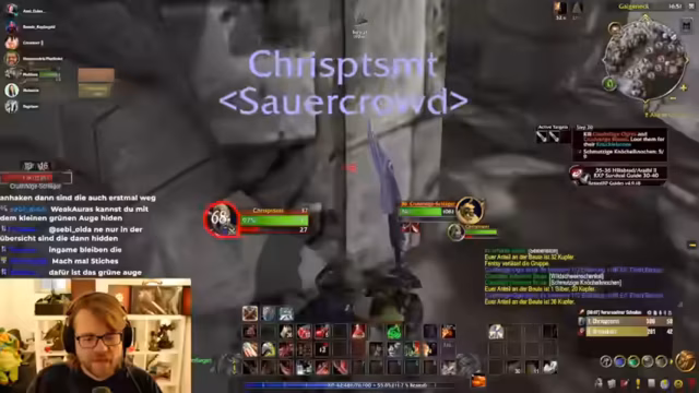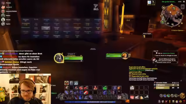 04:50:52Ein Gildenmitglied namens Carsten ist bei einer Gruppenquest in eine gefährliche Situation geraten, in der es knapp wurde. Er hat mehrere Gegner auf sich gezogen und musste sich konzentrieren, um die Situation zu meistern. Dies zeigt die Risiken von Aoe-Farming in einer Hardcore-Umgebung.