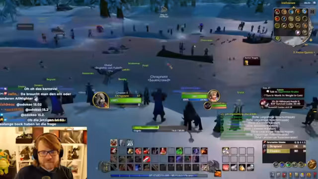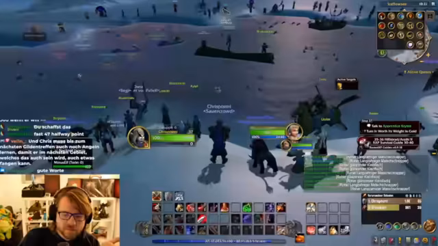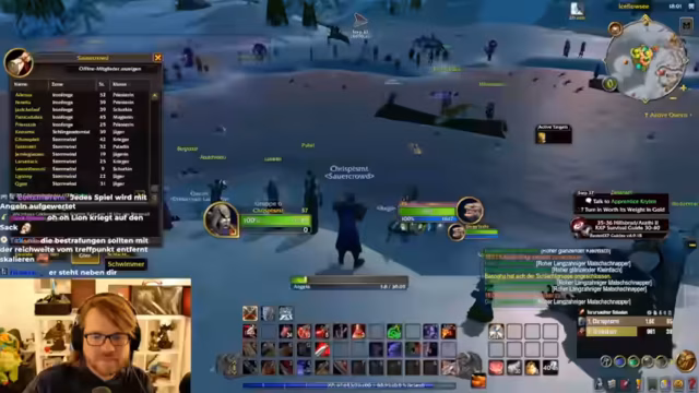 05:08:36Das Gilden-Meeting findet in Frostwolfgrat am zugefrorenen See statt. Der Streamer ist dabei auf dem Weg zur Hochzeit, aber er will auch noch kurz Mobs farmen, um Erfahrung zu sammeln. Es wird erwartet, dass alle pünktlich erscheinen, um gemeinsam zu angeln.