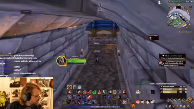 03:09:15Auf dem Weg zur Bank in Sturmwind wird ein kleiner Abstecher in die Burg unternommen, um eine Questreihe abzuschließen. Der Streamer überlegt, Seiten für eine spezielle Schmiederezept-Sammlung von Malki bei sich zu tragen, anstatt sie jetzt auf der Bank zu deponieren. Für die kommenden Tage plant er, seinen Bergbau-Skill zu erhöhen und sich beim Trainer über neue Fähigkeiten wie 'Zuschlagen' zu informieren.