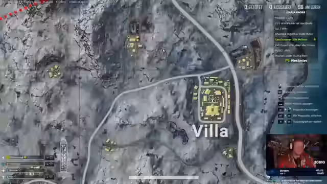 02:01:26Die PUBG-Runde beginnt mit der Festlegung einer entspannten Strategie. Es wird beschlossen, nicht 'gottlos zu schwitzen', sondern sich zunächst in einem abgelegenen Haus in der Zone zu verschanzen. Dort soll in Ruhe ein 'Wodka E' genossen werden, bis der Kreis klein genug ist, um einen Kill zu machen und die Runde zu beenden. Ein zufälliger Mitspieler namens Chalazuroman wird in das Team aufgenommen. Es wird beschlossen, ihm zu folgen und sich von ihm 'carrien' zu lassen. Die Teammitglieder springen aus dem Flugzeug und landen in Impala. Ein Auto wird gefunden und ein Roadtrip geplant, um die Landschaft zu genießen und nach 'Wodka-Shots' Ausschau zu halten. Die Stimmung ist ausgelassen und die Teammitglieder freuen sich auf die gemeinsame Zeit im Spiel.
