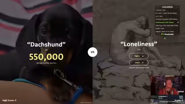05:52:03Franzi übernimmt den Stream und beginnt, das Higher-Lower-Spiel zu spielen. Sie muss einschätzen, ob ein Begriff mehr oder weniger Suchanfragen als der vorherige hat. Sie startet mit 'Violine' und muss entscheiden, ob 'Raging Bull' mehr oder weniger Suchanfragen hat. Franzi tippt auf 'Lower', was sich als richtig herausstellt. Es folgen weitere Vergleiche, darunter 'Franz Labyrinth' gegen 'iTunes', wobei Franzi und die anderen sich für 'iTunes' entscheiden. Sie diskutieren auch, ob 'iTunes' oder 'NFL' mehr Suchanfragen hat, wobei sie argumentieren, dass 'iTunes' globaler ist und daher mehr Suchanfragen generiert. Es werden weitere Begriffe verglichen, darunter 'How to train a dragon' und 'Koma Mercury', wobei astrologische Interessen an letzterem erwähnt werden. Die Runde wird mit verschiedenen Einschätzungen fortgesetzt, wobei die Gruppe versucht, die Popularität der Suchbegriffe richtig einzuschätzen.