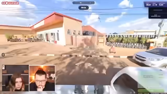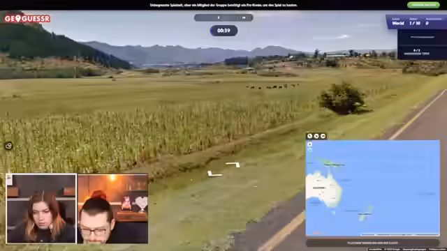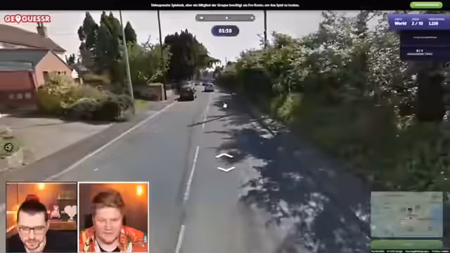 09:09:51Bei GeoGuessr wird eine private Lobby erstellt. Für jede Runde erhalten die Spieler zwei Minuten Zeit, um den Standort zu bestimmen. Der erste Versuch findet in Australien statt, wo anhand von Linksverkehr und der Form der LKWs auf den Kontinent geschlossen wird. Der zweite Standort ist eine größere Herausforderung. Nach ersten Fehlversuchen, wie Neuseeland und der Türkei, landet die Gruppe in einem kleinen, schwer identifizierbaren Land. Ein Hinweis auf eine spezielle Form von Zebrastreifen führt zur richtigen Antwort, Panama, nachdem die Runde bereits fast vorbei war.