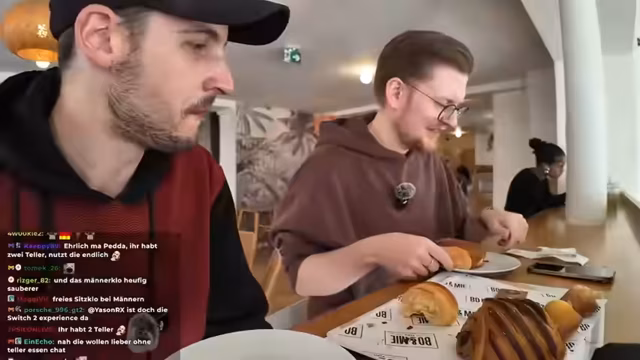 02:55:30Der Chat äußert sich positiv überrascht von der Nintendo Direct, bedauert aber die Exklusivität von From Software-Titeln. Es wird das Fehlen eines neuen Animal Crossing bemängelt, während die Technik zwar gelobt, aber als potenziell zu teuer eingeschätzt wird. Die Diskussion dreht sich um den Preis der neuen Konsole, wobei 469 Euro als Basispreis genannt werden. Die Aufmerksamkeit richtet sich auf Mario Kart World, dessen physische Version angeblich 90 Euro kosten soll, während das Bundle mit der Konsole für 510 Euro angeboten wird, was einen Preis von 40 Euro für das Spiel im Bundle bedeutet. Die digitalen Preise werden mit 80 Euro als ebenfalls hoch empfunden. Nach der Direct widmen sie sich den kulinarischen Genüssen und besuchen ein Geschäft, in dem sie verschiedene Croissants und andere Backwaren bestellen, wobei sie den persönlichen Kontakt minimieren möchten. Die überwältigende Auswahl und die Frage, ob man dort sitzen kann, werden thematisiert, bevor die Bestellung auf Englisch aufgegeben wird. Nach anfänglichen Schwierigkeiten mit der Eingabe des Nachnamens werden verschiedene Köstlichkeiten ausgewählt, darunter Mini-Butter-Croissants und ein Eclair. Die Bestellung wird schnell bezahlt, wobei der Planet kurz warten muss, da die Angst überwiegt, etwas zu verpassen.