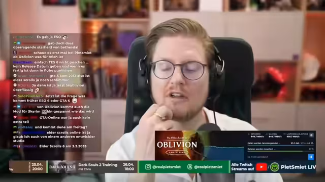 01:25:14Der Stream beginnt mit einer Diskussion über die Wartezeit zwischen The Elder Scrolls 5 und 6, wobei erwähnt wird, dass die Zeit zwischen GTA 5 und GTA 6 wahrscheinlich kürzer sein wird. Der Chat schlägt vor, dass Oblivion als Übergang für das nächste Elder Scrolls dienen könnte. Es wird die Downloadrate erwähnt und der Streamer plant, seine Leitung zu wechseln, da die aktuellen Geschwindigkeiten als absurd bezeichnet werden. Gleichzeitig werden technische Aspekte des Downloads besprochen und die Performance des neuen PCs erwähnt.