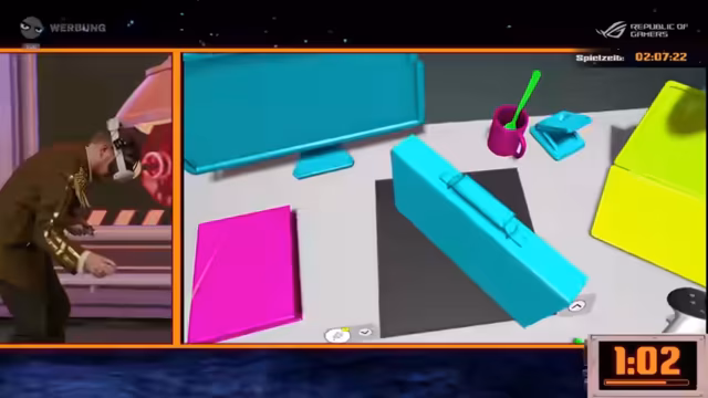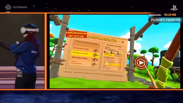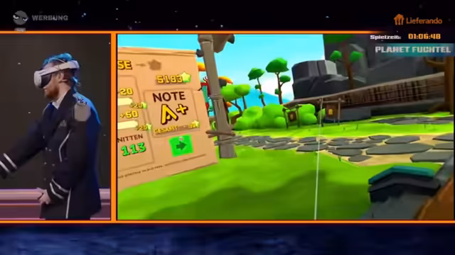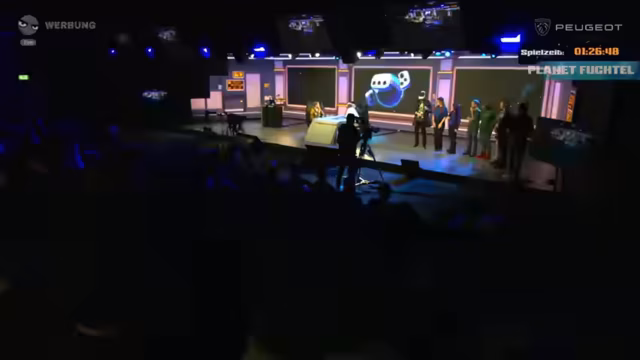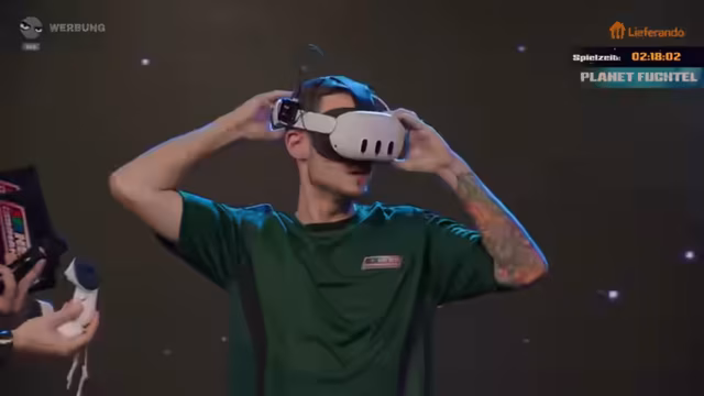 01:24:45Maxim plant seinen ersten Zug und entscheidet sich für einen „Triple-Fuchtlung“-Angriff auf Planet Fuchtel. Er setzt Fabian, Vicky und Nasti in dieser Reihenfolge als Angreifer ein. Peter verteidigt mit Sebastian und Christian. Das Spiel auf Planet Fuchtel ist „Walkabout Minigolf“ mit einem Steinschleuder-Zeitspiel-Modus in VR, gespielt mit der Meta Quest 3. Die Spieler haben 60 Sekunden Zeit, um so viele Ziele wie möglich mit der Steinschleuder zu treffen, wobei genauere Treffer mehr Punkte bringen. Fabian beginnt, hat aber zunächst Schwierigkeiten mit der VR-Brille und der Steuerung, was zu amüsanten Unterbrechungen führt. Nach einigen technischen Anpassungen und Erklärungen zur Bedienung der Steinschleuder, erzielt Fabian 180 Punkte. Sebastian versucht, diesen Wert zu übertreffen, und erreicht 300 Punkte. Vicky und Nasti scheitern daran, Sebastians Highscore zu schlagen, wodurch Planet Fuchtel erfolgreich von Peters Team verteidigt wird.