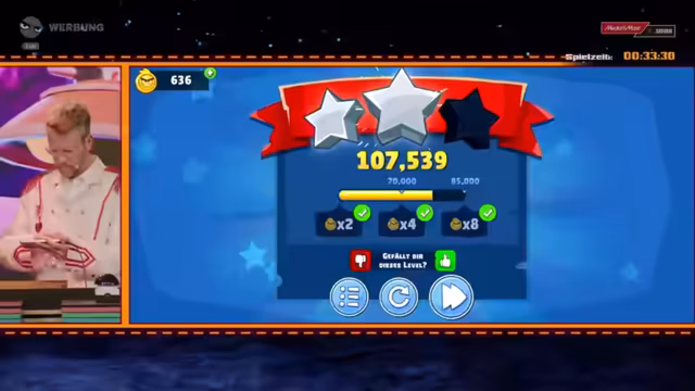 04:21:43Nils zeigte beeindruckende Fähigkeiten im Spiel Angry Birds, indem er wiederholt drei Sterne in den Levels erreichte. Seine Konzentration und Präzision wurden von den Kommentatoren gelobt, die seine Leistung als außergewöhnlich empfanden. Trotz der anfänglichen Skepsis und der Annahme, dass er vielleicht nicht so gut sei, bewies Nils das Gegenteil und dominierte das Spiel. Die Zuschauer waren fasziniert von seiner Fähigkeit, die Schweine mit wenigen Vögeln zu besiegen und hohe Punktzahlen zu erzielen. Nils spielte insgesamt sieben Levels und beendete seine Runde mit einer beeindruckenden Punktzahl, was die Erwartungen der Anwesenden übertraf und ihn als starken Spieler etablierte.