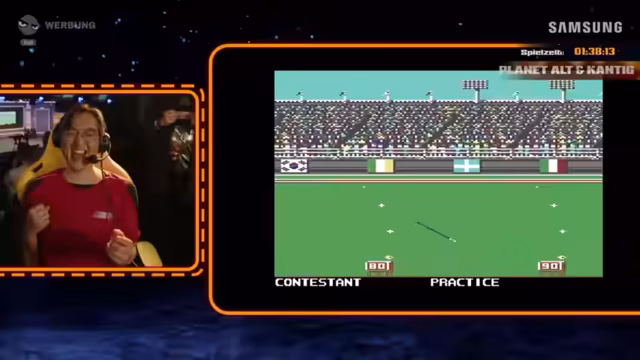 02:32:09Peter entscheidet sich, den Planeten Alt und Kantig anzugreifen. Er wählt Sebastian, Christian und Brammen für den Angriff, während Budi und Janina den Planeten verteidigen. Das Spiel ist Summer Games 2 auf dem C64 Mini, eine Speerwerfen Highscore Challenge. Die Regeln sind einfach: Die Spieler müssen nacheinander einen Bestwert im Speerwurf aufstellen. Durch häufiges Drücken des Controllers wird Tempo aufgebaut, und kurz vor Ende der Bahn muss der Wurfwinkel mit dem Stick eingestellt werden. Übertreten der Linie zählt als Fehlversuch, und jeder Spieler hat drei Versuche. Sebastian beginnt und hat Schwierigkeiten mit dem Timing, was zu Fehlversuchen führt. Janina versucht, Sebastians Bestwert von 67,12 Metern zu schlagen, aber auch sie hat Schwierigkeiten, den optimalen Winkel zu finden. Budi tritt an und erzielt einen neuen Rekord von 71,56 Metern, den es nun zu schlagen gilt. Christian tritt als letzter an und schafft es, Budi mit 82 Metern zu übertreffen. Damit ist der Angriff erfolgreich, und Planet Alt und Kantig geht an Peter.