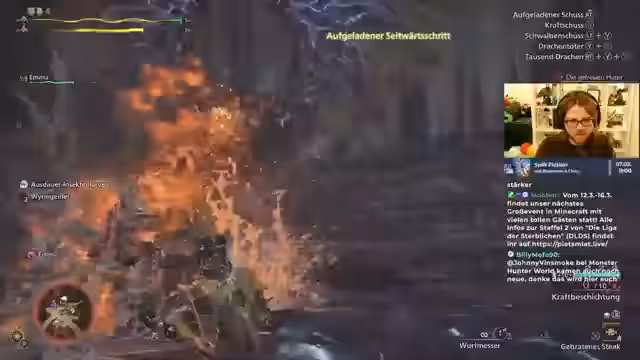 09:19:50Ein Spieler brennt und versucht, durch Rollen das Feuer zu löschen, während er gleichzeitig Rationen isst, um seine Gesundheit wiederherzustellen. Es wird diskutiert, wie man sich vor Umgebungsschäden wie Feuer schützen kann und welche Ausrüstung dafür geeignet ist. Ein Spieler sucht nach einem besseren Bogen und zielt auf den Kopf des Monsters, um Wunden zu öffnen. Nach dem erfolgreichen Kampf freut sich die Gruppe über seltene Materialien und das Loot, das sie erhalten haben. Es wird erwähnt, dass einer der Spieler in der Story etwas weiter ist und den anderen helfen kann, was zu doppelten Materialien führt. Die seltenen Objekte, die gesammelt wurden, sind Deko-Elemente, die in die Rüstung eingesetzt werden können, um die Werte zu verbessern. Ein seltener Likör wird für die Brustplatte benötigt, und es wird ein Streamer-Bonus erwähnt.