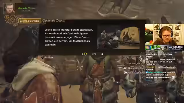 12:29:26Die Gruppe bereitet sich auf eine Mahlzeit vor, bevor sie sich wieder dem Spiel widmet. Es wird über das detaillierte Essen in Monster Hunter gesprochen und wo sich der Achkwild befinden könnte. Die Spieler erstellen ihre Charaktere und tauschen sich über das Essen und die Freundlichkeit der Leute aus. Es wird kurz überlegt, warum ein vorheriges Spiel untergegangen ist. Wissenschaft wird als wichtig hervorgehoben, und die Suche nach Arkveld wird angekündigt. Der Jäger-Rang 6 wird erreicht, und es gibt Überlegungen zur Ausrüstung, wobei der Fokus auf Verteidigung und Element-Boni liegt. Es folgt eine Verbesserung der Ausrüstung, insbesondere im Hinblick auf Feuerresistenz. Magisches Pulver wird erwähnt, und es gibt Diskussionen über den Bogen und dessen Verbesserungen. Die Gruppe richtet ein Lager ein und sammelt Ressourcen, während sie sich auf die bevorstehende Jagd vorbereitet. Es wird festgestellt, dass die Monster wendiger sind und die Gruppe sich auf die Untersuchung begibt. Die bisherigen Eindrücke vom Spiel werden geteilt, wobei das Kämpfen und Upgraden positiv hervorgehoben werden.