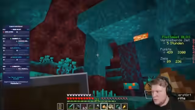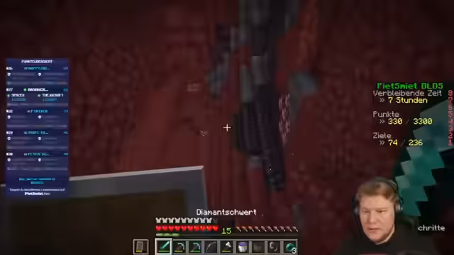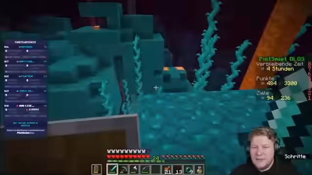 05:22:01Die Spieler arbeiten konsequent an der Verbesserung ihrer Punktzahl im Leaderboard. Sie erzielen Punkte durch das Sammeln seltener Materialien wie weinenden Obsidian, Glowstone und das Erreichen bestimmter Achievements. Sie planen ihre Route strategisch, um wichtige Biome wie Festungen zu finden, die wertvolle Ressourcen und Fortschrittsmöglichkeiten bieten. Die Koordination und Kommunikation ist entscheidend, um ihre Position im Wettbewerb zu halten.