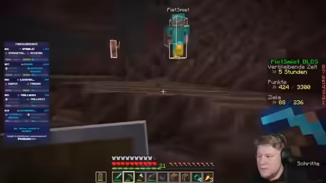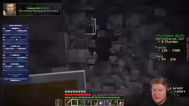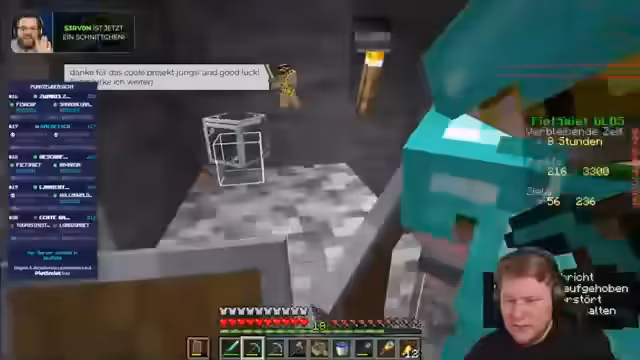 02:12:13Während des Bergbaus stoßen die Streamer auf verschiedene Ressourcen wie Gold und Obsidian. Sie stoßen auch auf Lava, was zu gefährlichen Situationen führt. Dabei wird über die Verwendung von Fortune 3 auf der Spitzhacke diskutiert, um mehr Ressourcen zu erhalten, und sie erleben einen Creeper-Angriff, der jedoch erfolgreich abgewehrt wird.