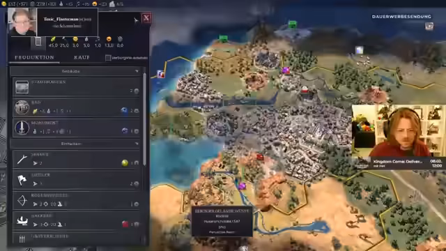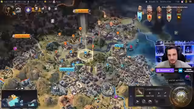 01:57:03Christian gibt einen Überblick über seine aktuelle Spielsituation, einschließlich seiner Hauptstadt und anderer Städte. Er konzentriert sich darauf, seine Forschung zu verbessern und Kodizes zu sammeln, nachdem er diese vernachlässigt hat. Plötzlich auftretende Unzufriedenheit in seinen Städten zwingt ihn zu schnellen Anpassungen, wobei der Chat ihm Stadtmauern empfiehlt. Es wird betont, dass Backseat-Gaming und Meta-Gaming unerwünscht sind. Christian rätselt über die plötzliche Unzufriedenheit und freut sich über die Rückkehr zur Zufriedenheit. Er plant den Bau einer Arena, um die Stimmung zu verbessern und investiert Gold. Es wird spekuliert, dass das Problem möglicherweise mit der Ausrichtung seiner Politik zusammenhängt. Die Mods werden angewiesen, bei Regelverstößen einzugreifen. Es wird überlegt, was als Nächstes gebaut werden soll, wobei Zufriedenheit Priorität hat. Die Möglichkeit von Revolten in mehreren Städten wird angesprochen, was Christians Situation verschärfen könnte.