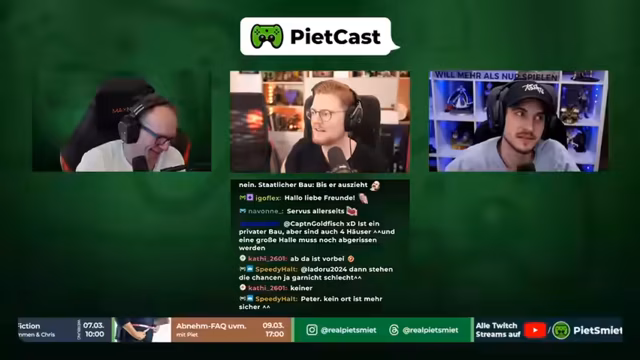 00:02:07Nach einem technischen Zwischenfall wurde der Stream mit einem Video-Intro gestartet. Herzlich willkommen zum PietCast Folge 472, präsentiert von Jonathan, Sebastian und Peter. Die Moderatoren blicken auf ihre Erlebnisse des Karnevals zurück und berichten, dass Peter, im Gegensatz zu den anderen, den Karneval nicht direkt gefeiert hat, da er körperlich am Hausausbau arbeitete.