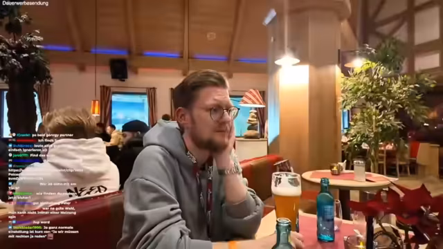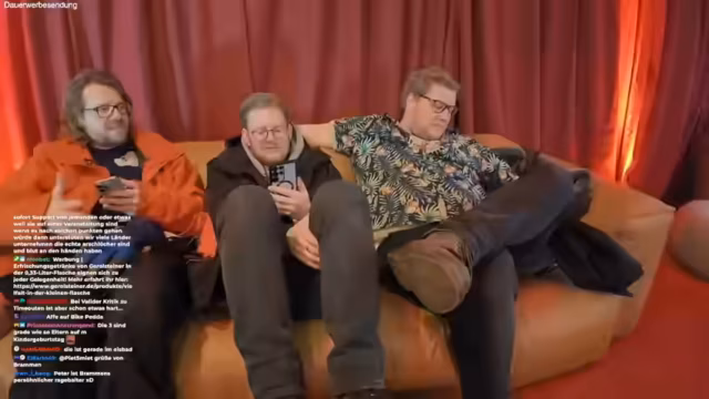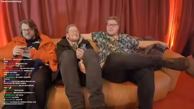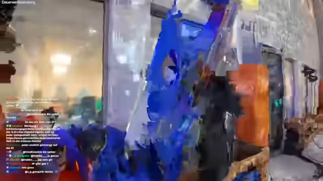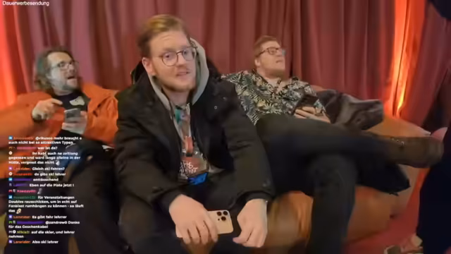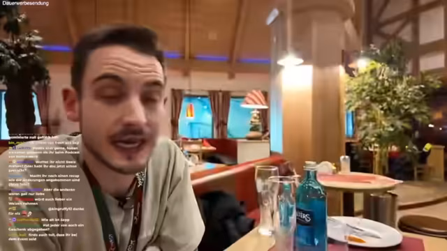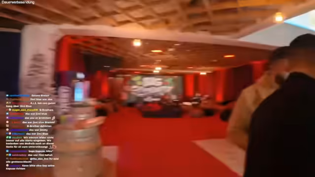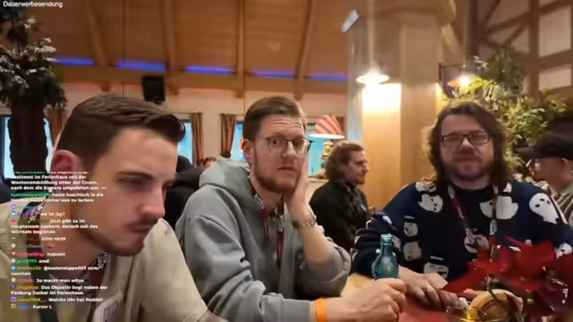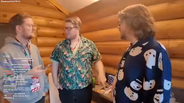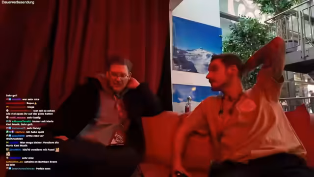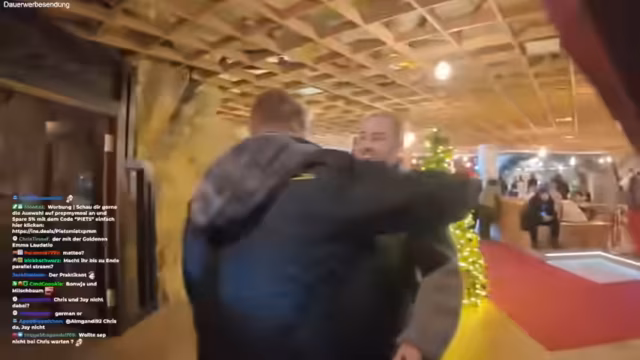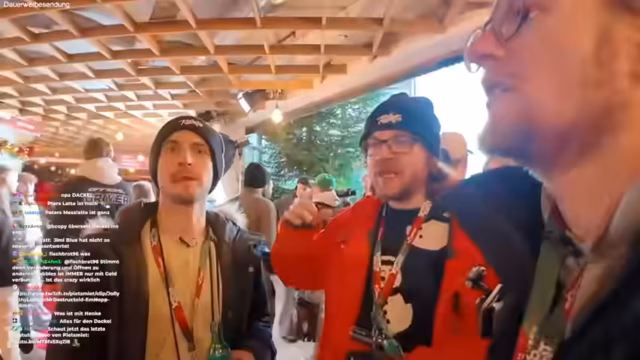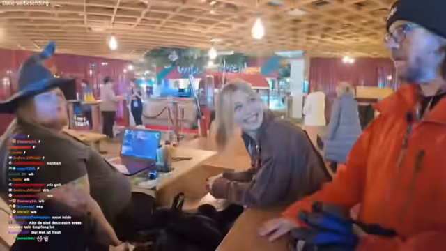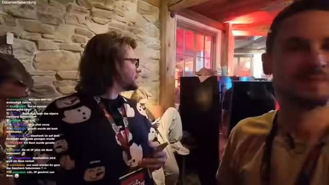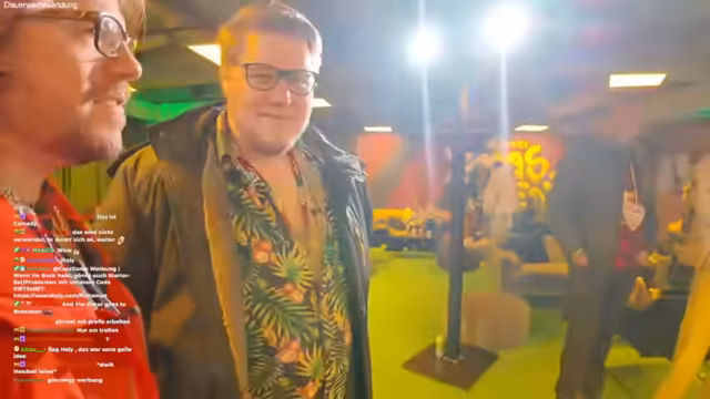 03:29:13Teilnehmer besuchen eine 'Porno-Lounge' zum Ausleihen von Ausrüstung und diskutieren die Goldene Karte. Es folgen spontane Standortwechsel für bessere Aufnahmen (z. B. vor Vorhängen oder Geschenktürmen). Ein Gast erwähnt sein Wichtigkeit, einen Schlitten tätowieren zu lassen, was humorvoll aufgenommen wird. Der Stream wird von technischen Problemen wie Verbindungsabbrüchen begleitet.