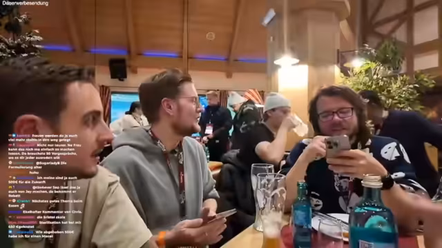 04:12:31Es treten erhebliche technische Probleme mit der Internetverbindung auf, die zu Standbildern im Stream führen. Die Produktionsleitung wechselt automatisch zu einer Backup-Kamera, wenn das Signal schwach wird. Als die Hauptproduktion in den unteren Bereichen der Skihalle stattfindet, verschlechtert sich die Verbindung, da zu viele Leute gleichzeitig Bandbreite nutzen. Die Teilnehmer diskutieren Lösungsansätze und entscheiden sich, in die oberen Bereiche der Halle zu wechseln, wo das Signal stabiler ist. Die Produktionscrew bleibt unten, um den Stream aufrechtzuerhalten.