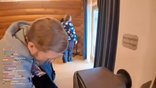 00:57:36Die Gruppe teilt Anekdoten zum Wichteln, darunter eine Geschichte, bei der eine Person dreimal dieselbe Person gezogen hat. Sie plant Versteckspiele mit Kindern und beschreibt die Schlafbedingungen im Event-Bereich: Einzelbetten in einem Zimmer mit ungewöhnlichem Geruch (verglichen mit Hamsterurin), was zu humorvollen Kommentaren über die Aufteilung der Schlafplätze führt.