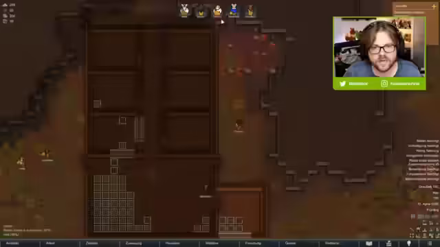 01:20:16Der Spieler erkundet einen alten Standort und stellt fest, dass keine unmittelbare Gefahr besteht. Es wird über den Bau von Holzböden und die Erweiterung der Kolonie gesprochen, einschließlich des Baus einer Küche, eines Essenslagerraums und eines Forschungszimmers. Der Spieler bemerkt, dass Stahl abgebaut wird und die Kolonisten Licht benötigen. Stubenhocker-Kolonisten bevorzugen Dunkelheit, daher sollen Dunkelpilzfackeln aufgestellt werden. Es wird überlegt, ob ein Affe geschlachtet werden soll, aber Peter ist dagegen. Betten werden benötigt, und der Spieler erklärt, dass das Spiel kein festgelegtes Ende hat. Faultiere sind am Anfang zu stark zum Jagen. Jay soll Tiere zähmen und melken. Peter, Sepp und Jay sind Stuhlmokker.
