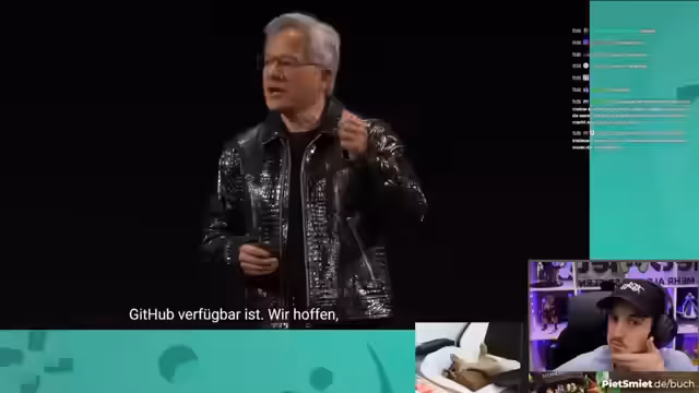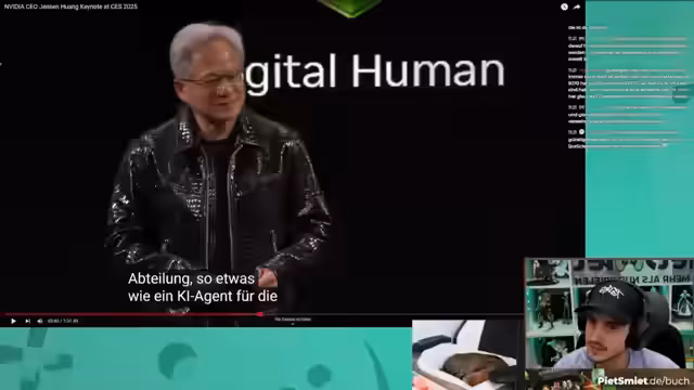 00:20:24Der Fokus verschiebt sich vollständig auf die Nvidia Keynote. Der Streamer analysiert die Präsentation von Jensen Huang und die Ankündigung der neuen RTX-5000er-Serie. Die neuen Grafikkarten, insbesondere die 5090, werden hinsichtlich ihrer Preisgestaltung (2000 Dollar) und Leistungssteigerungen (doppelt so schnell wie die 4090) im Detail besprochen. Technologien wie KI-generierte Pixel, Neurorendering und die Energieeffizienz werden als zukunftsweisend dargestellt.