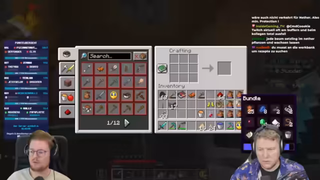 07:54:18Bevor der Streamer den Nether betritt, sammelt er noch wichtige Ressourcen. Er holt sich Netherquartz für einen geplanten Tageslichtsensor, benötigt dafür noch Glas und Holzstufen. Auch der Bau eines Werfers wird vorbereitet, indem ein Bogen und Redstone benötigt werden, um spezielle Achievements zu erreichen. Inventarplatz wird durch das Craften von Bündeln optimiert, wobei überflüssige Gegenstände wie Schlüssel verworfen werden.