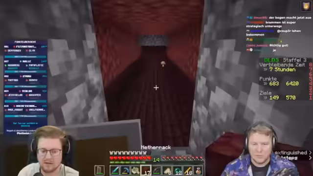02:56:11Nach einem Nether-Disconnect, bei dem der Streamer knapp dem Tod entgeht, beginnt die Konzentration auf das Bauen und Erkunden. Ein Redstone-System wird konstruiert, das automatisch Gegenstände in eine Truhe sortiert. Der Bau einer Endertruhe wird ebenfalls als wichtiger Schritt für die Ressourcenverwaltung getätigt. Die Erkundung des Nethers wird von der Angst vor Lava und dem Verlust von wertvollen Ressourcen begleitet, was zu riskanten Manövern und knapp verpassten Punkten führt.