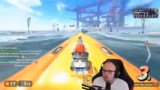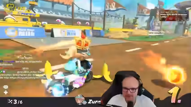 01:23:43Das Rennen ist von ständigen Positionskämpfen und Platzwechseln geprägt. Der Streamer wechselt ständig zwischen den vorderen und hinteren Plätzen und wird häufig von Items wie Blitzern, Raketen und Bananen getroffen. Trotzdem bleibt er motiviert und versucht, mit Items wie Goldenen Pilzen nach vorn zu gelangen, was aber oft durch Angriffe aus dem Hinterhalt verhindert wird.