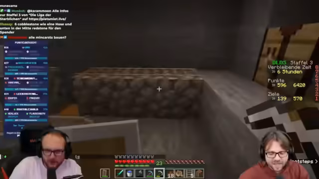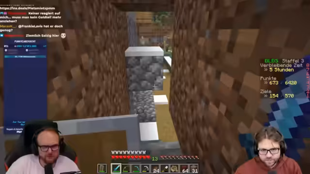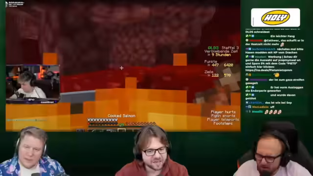 04:56:43Nach einem Raid von 'flauschig' wird die Situation im Nether geschildert, wo ein Piglin versehentlich angegriffen wurde, was zu einer aggressiven Reaktion führte. Es wird darauf gewartet, dass die Piglins wieder wohlgesonnen sind, während der Spieler noch zu Abend isst. Die Frage, ob der Drache noch gemacht werden soll, wird aufgeworfen, wobei der Plan ist, zu handeln und eine Festung zu suchen. Informationen zu noch zu holenden Punkten sind über 'slash drds' im Spiel oder auf 'peaceme.live' verfügbar. Es wird diskutiert, dass Chunks nicht geladen bleiben, wenn niemand in der Nähe ist, was die Aggro der Piglins beeinflussen könnte. Das Ausscheiden mit 530 Punkten wird als belastend empfunden, insbesondere für Minecraft-Neulinge, aber jeder Punkt wird als cool und nicht schlecht bewertet. Es wird ermutigt, beim nächsten Mal mehr zu erreichen. Es fehlen noch 25 Punkte bis zur Geschäftsführung, was als schwierig erreichbar angesehen wird, da die Gegner mehr Zeit haben und Bram komplett auf Sicherheit spielt. Das Abendessen besteht aus Salat mit Gurke, Feta, Paprika, Hähnchenstreifen und Honig-Senf-Dressing. Die Möglichkeit, eine Monsterfalle für XP-Farmen zu bauen, wird diskutiert, um Level 50 zu erreichen, was als machbar erachtet wird. Es wird auch über den Kauf von Viewern gesprochen und wie Firmen dies für Werbepartner verfolgen können, um die 'Brand Safety' zu überprüfen.