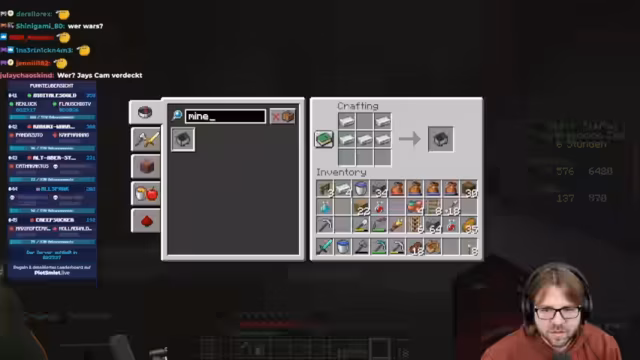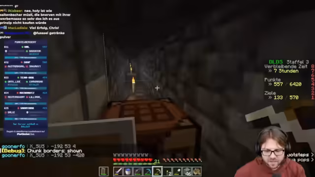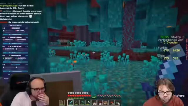 04:41:38Der Stream beginnt mit dem Aufzählen der verbleibenden Nether-Aufgaben für das DLDS-3-Event. Dazu gehört das Töten von Kreaturen wie einen Ghast mit einer Feuerkugel, einen Hoglin durch das Stoßen in Lava und das Erlegen eines Lohen mit einem Feuerpfeil. Auch das Klauen eines Goldblocks aus einer Bastion ist Teil der Liste. Der Streamer gibt an, dass er und sein Team derzeit mit 530 Punkten ausgeschieden sind, was eine belastende Situation darstellt, da andere Teams wie Blatt und Rumatantreal noch deutlich mehr Punkte und Restzeit haben.