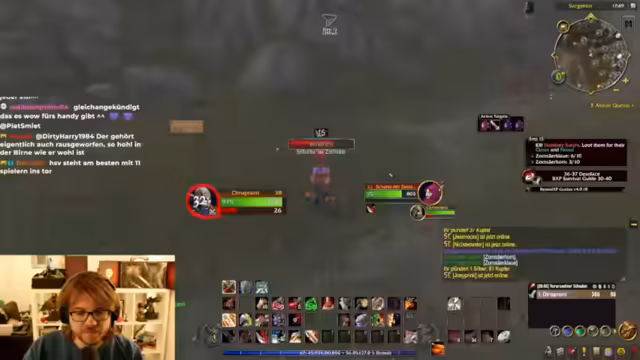 00:14:40Während der Farming-Quest für Schläuche in Tanaris kommt es zu mehreren Problemen und Todesfällen innerhalb der Gruppe. Der Streamer beschreibt, wie Henki, der auf Level 43 einen Level-up-Tod erleidet, und später auch Chromie auf Level 40 stirbt. Ein Disconnect wird als mögliche Todesursache vermutet, was den Streamer frustriert. Eine weitere toxische Situation entsteht, als ein Magier mit AOE-Farm die Kontrolle verliert und die gesamte Gruppe in die Gefahr zieht, was zu weiteren Toten führt.