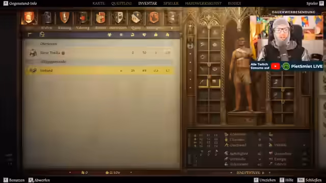 05:28:37Der Streamer hat nun mehrere aktive Quests, darunter die Suche nach Köter und das Erlangen von Zugang zur Hochzeit. Es wird diskutiert, wie der spezifische Ruf zu einzelnen NPCs in der Spielwelt überprüft werden kann. Das Inventar wird geprüft und festgestellt, dass die Ausrüstung stark beschädigt ist. Einige Gegenstände können repariert werden, aber dies kann dauerhaft Qualitätsverlust bedeuten.